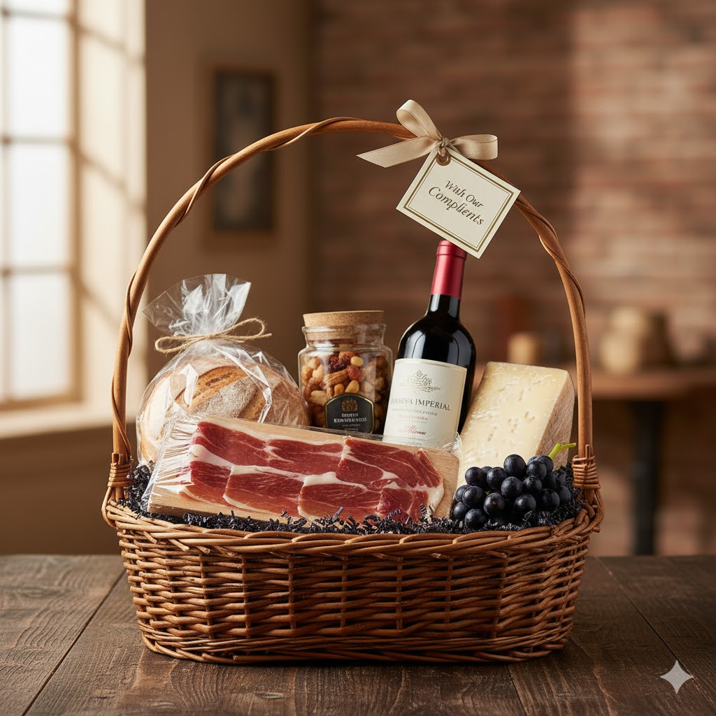 Canasta gourmet con vino, quesos y productos selectos para celebrar con estilo.